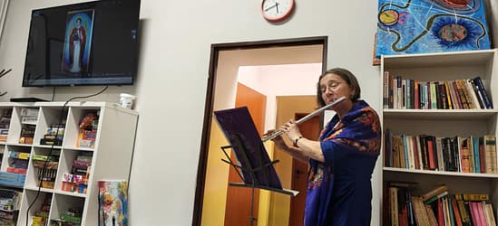 Do prelekcji towarzyszyła delikatna, ale intensywna oprawa muzyczna Alicji Lewandowskiej, która grała utwory muzyki klasycznej. Jej gra na flecie poprzecznym, pełna melancholii i spokoju, doskonale komplementowała atmosferę refleksji, tworząc tło dla głębszego zrozumienia słów prelegentki.