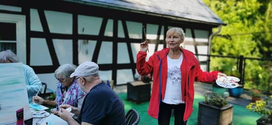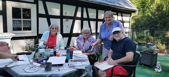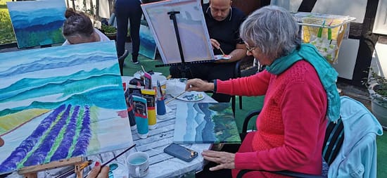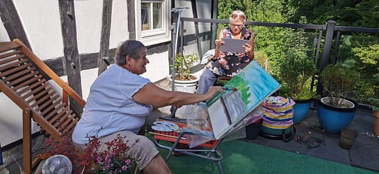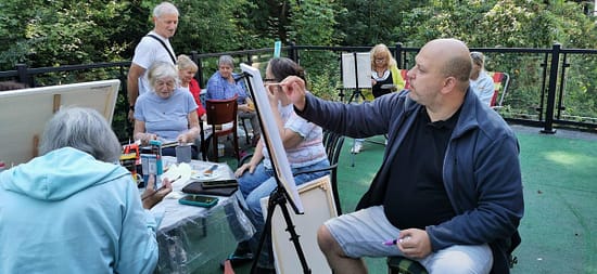 Właścicielka obiektu, pani Mirka, przyjęła artystów z prawdziwą gościnnością. Obszerny taras młyna przekształcił się w plenerową pracownię, gdzie wszyscy twórcy znaleźli swoje miejsce. Wrześniowa aura dopisała, pozwalając na pełne oddanie się twórczej pasji pod błękitnym niebem Sudetów.