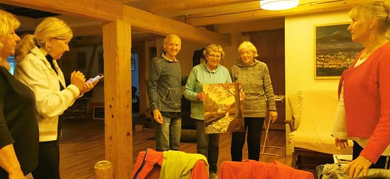Szczególnym momentem było czytanie wierszy przez Izę Bill, które dopełniło artystyczny obraz pleneru. Jej słowa nadały dodatkowy wymiar wizualnym pracom, tworząc poetycką oprawę dla malarskich i fotograficznych interpretacji karkonoskiej przyrody. To właśnie wtedy na zakończenie pobytu w Starym Młynie pani Mirka obdarowała nas swoją akwarelką z tematem karkonoskich ostępów. Wszystkim bardzo się spodobał ten niezwykły prezent.