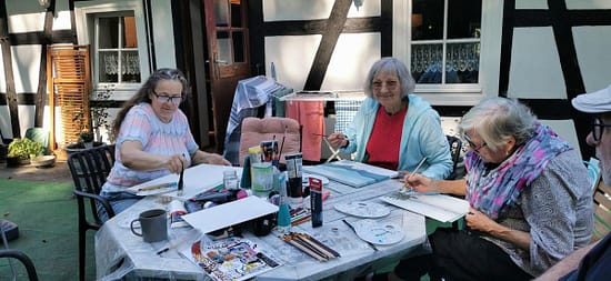 Jest to dla nas czas relaksu i oddechu od rutyny dnia codziennego. Okazuje się, że prosta czynność nakładania kolorowych farb na płótno lub papier ma duże znaczenie terapeutyczne. Polecamy wszystkim zestresowanym i zmęczonym szarą codziennością taki relaks. Nasze obrazy stanowią także formę podziękowania dla gości spotkań klubowych. Na zdjęciu Ala Miernik prezentuje urodzinowy prezent od nas, czyli swoje własne dzieła, które stworzyła na środowych zajęciach.